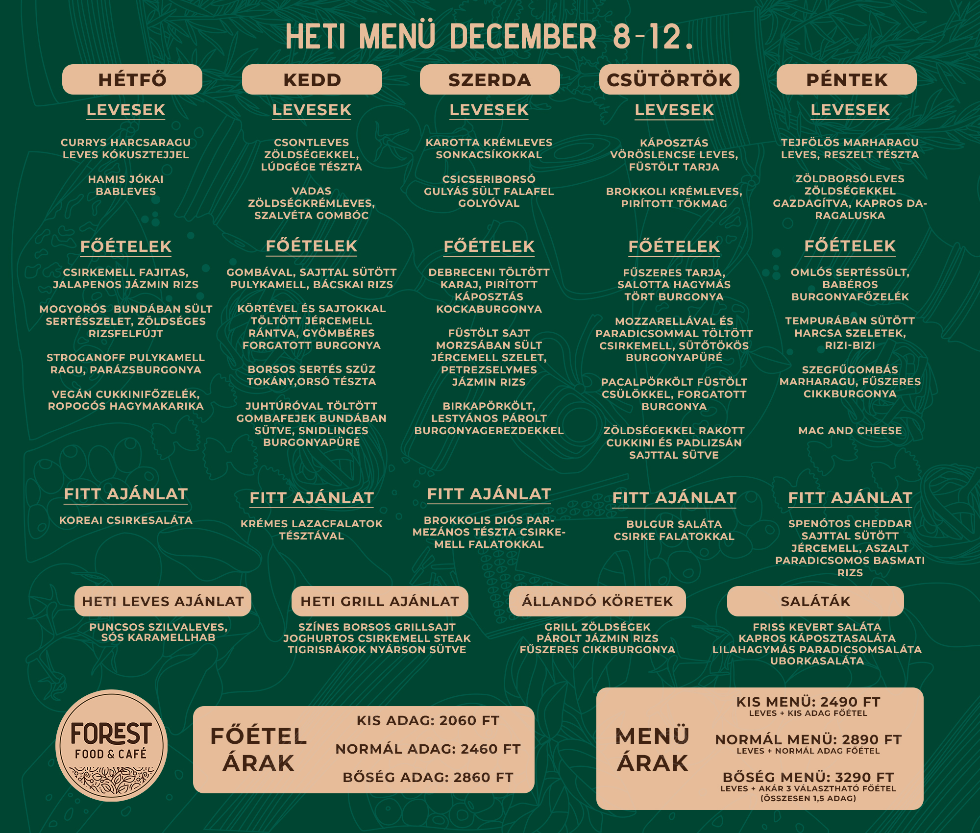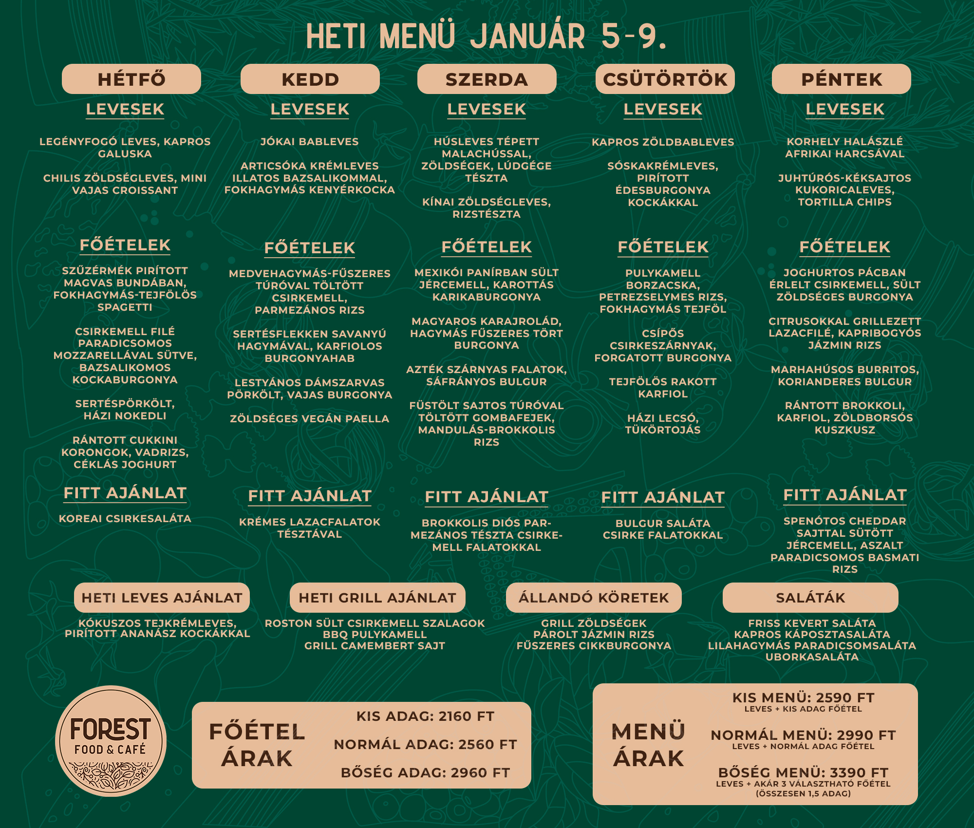 2 féle leves, 4 féle főétel, amelyből 1 vegetáriánus